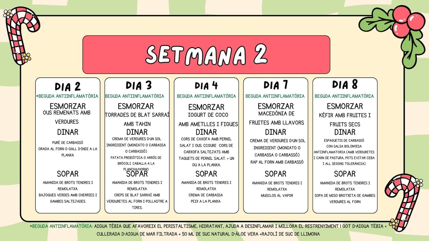 Deixem enrera els Nadals, per donar la benvinguda a l'any nou, aquest 2026! Un 2026 ple de reptes i salut! Us deixo el menú només de dies no festius de la setmana 2 i un protocol antiinflamtori molt fàcil. Els hàbits antiinflamatoris són exactament els mateixos que els immunitaris.